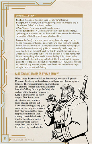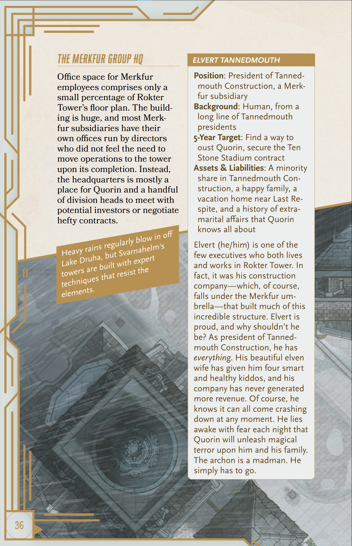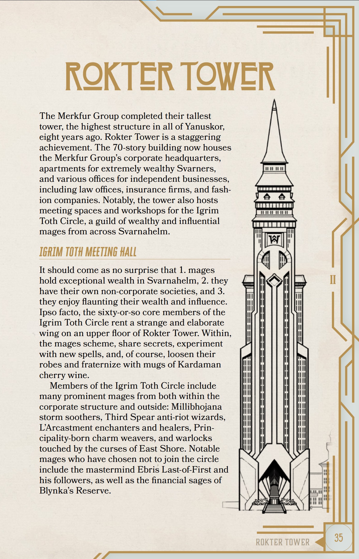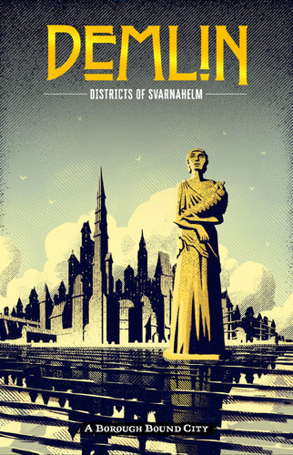 Demlin is the sleek, towering, corporate heart of Svarnahelm, an autonomous metropolis filled with arcanomechanical wonders. Ruthless archons compete with one another in stone skyscrapers while mages, corrupt police officers, and amoral freelancers fight proxy wars on the city streets. Race financial sages on levitating rickshaws, sabotage pneumatic postal tubes, and ride fliplifts up to elegant penthouses. In this golden commercial hub, contracts and corporate conquerors control the city's destiny.